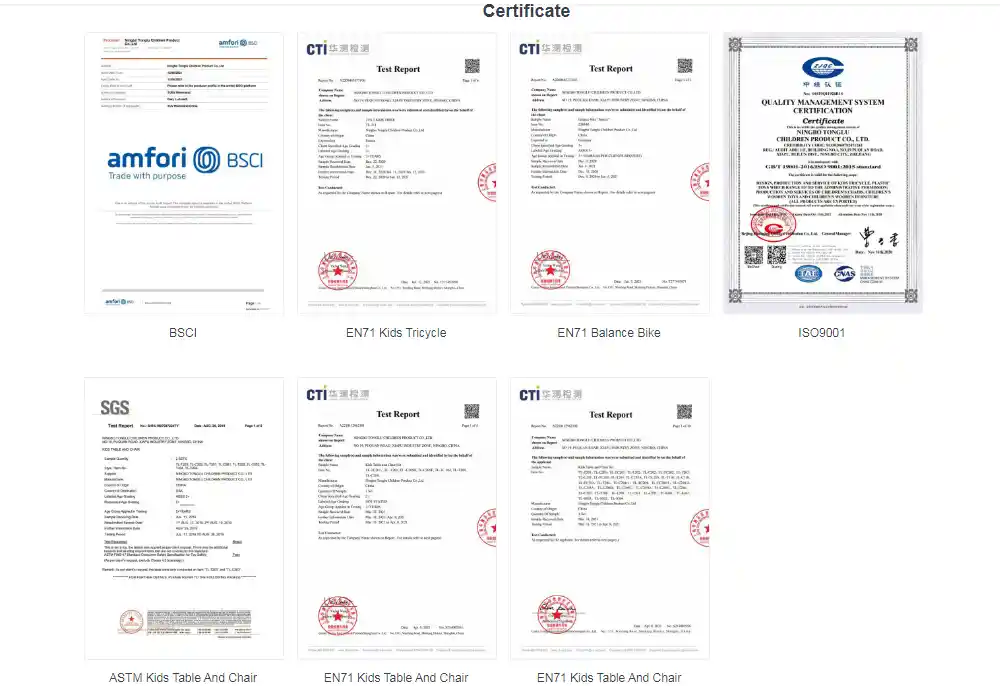 сияқты сертификаттарEN71жәнеASTMбіздің екенін көрсетедібалалар мен сәбилерге арналған трикер for материалдардың улы еместігіне, бұрыштары қолды кесіп тастайтынына және бөлшектердің беріктігіне қатысты арнайы сынақтардан өтті және қауіпсіздік стандарттарына сай болды.